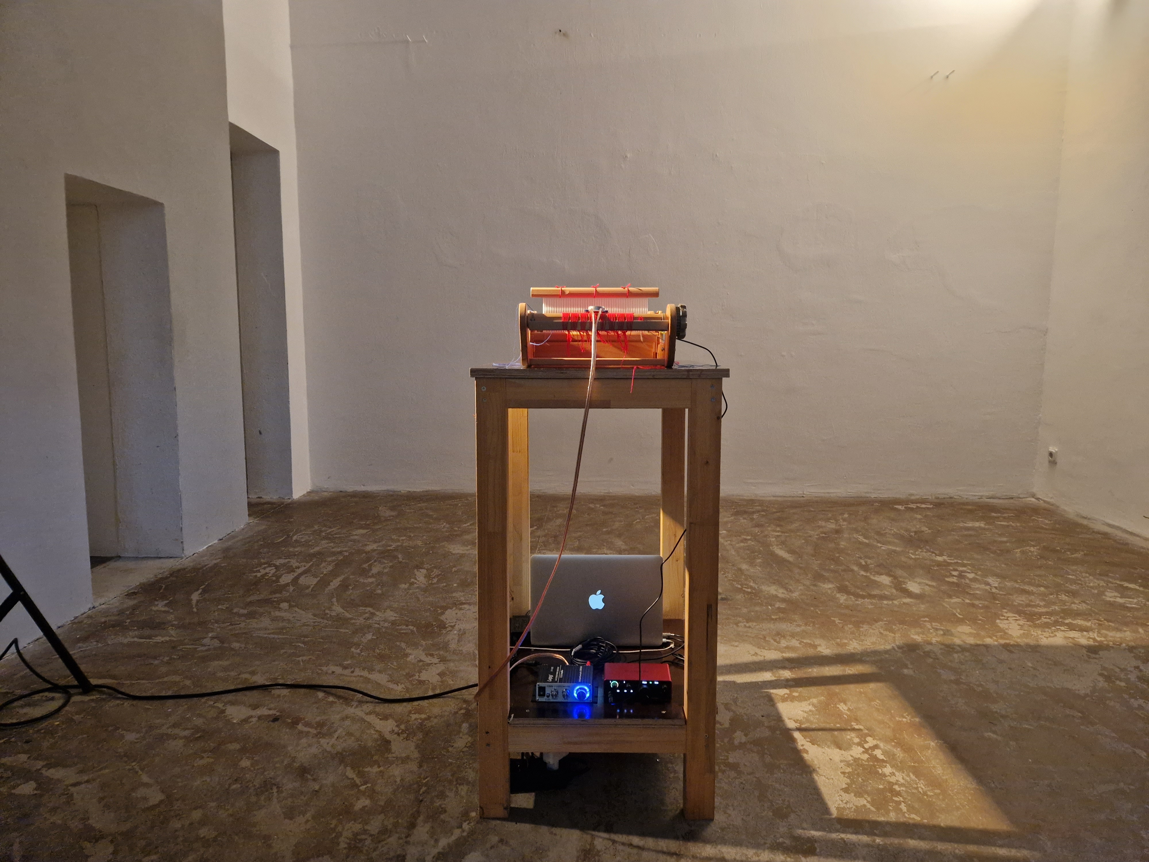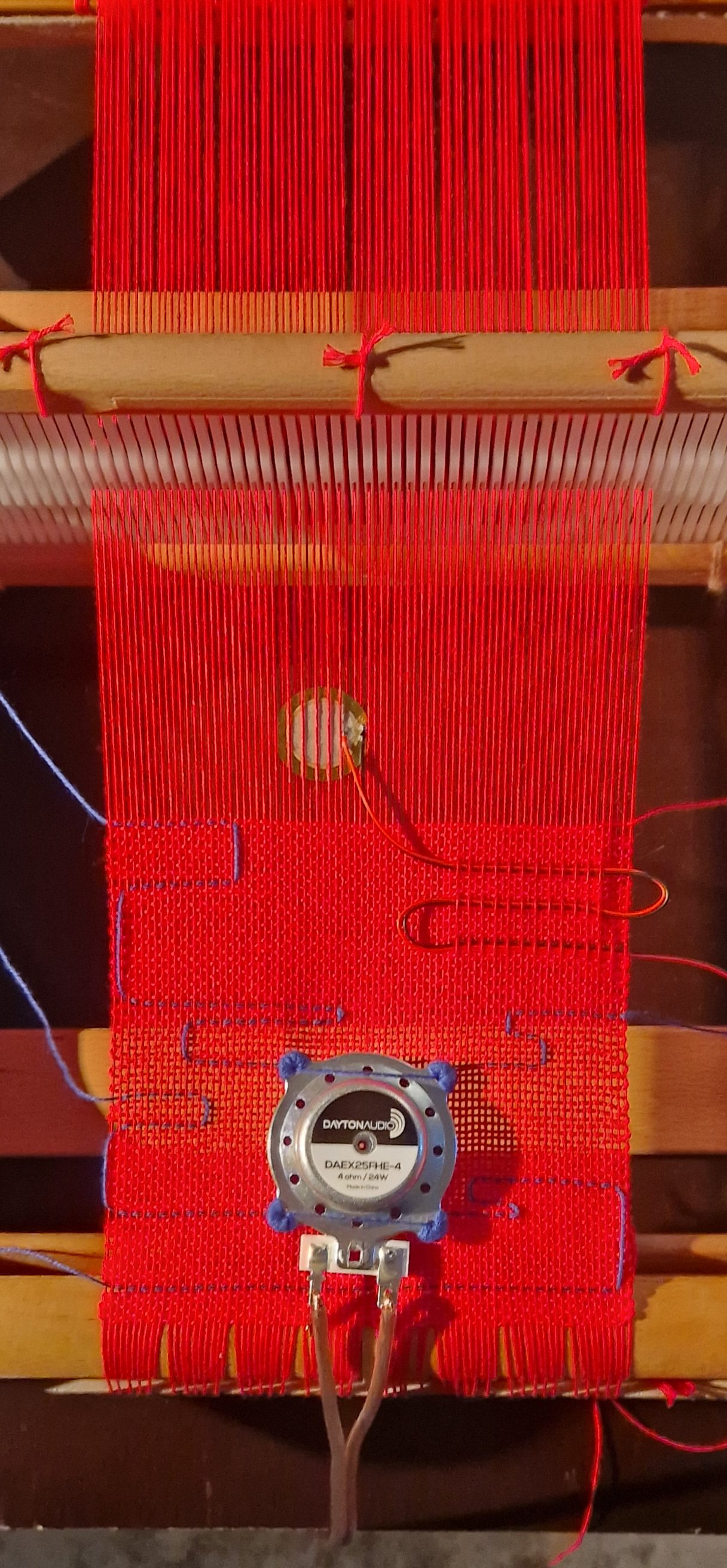In acoustics, textiles are usually used to dampen and absorb sound. In the sound installation “Feedbackleitfaden”, a fabric made of cotton threads stretched on a weaving frame is intended to do the exact opposite by becoming part of an acoustic resonance system. A contact loudspeaker and a contact microphone are woven into this fabric. The vibrations recorded by the microphone are modulated by a computer program and transmitted back to the threads via the loudspeaker, creating an audible feedback loop. The sounds are influenced by chance and the decisions of the algorithm and create a constantly changing impression between control and loss of control. The visibly vibrating fabric is both the central sound medium and the visual focus of the installation, which always reveals different auditory and visual details when viewed from different angles and distances.